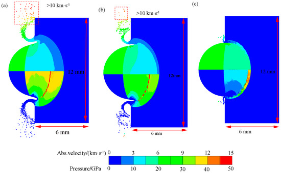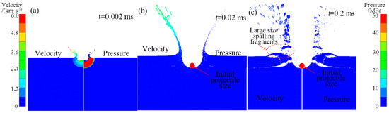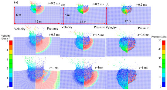 The ejection velocity (left column) and pressure (right column) distribution at different times of aluminum projectile impact on homogeneous basalt at 6.15 km·s−1: (a) 0.002 ms; (b) 0.02 ms; and (c) 0.2 ms.
