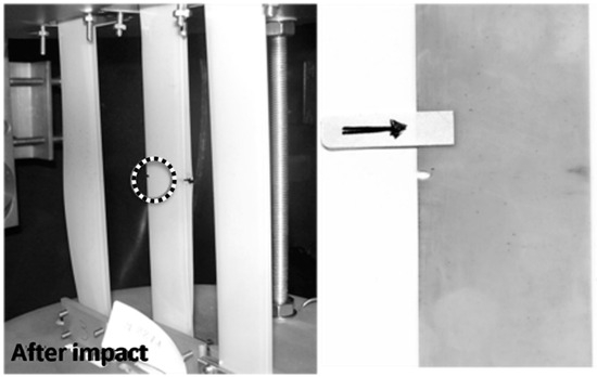 Test no. 8871 (PEEK LITE, α = 90°): setup with highlighted the damage area (left); detail of the tape damage with a marker arrow for analysis (right).