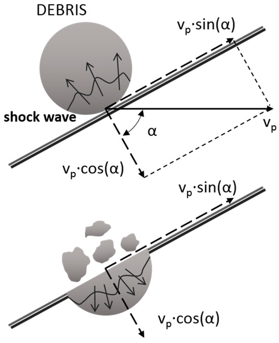 The damage equation for the range 0–80°, reported in Equation (4) (AHM), describes the tether damage as a function of the main geometrical parameters. Data from the experiments and simulations, as well as additional experiment data from the literature, were employed to derive the values of the damage equation coefficients for Al-1100 and PEEK. Results presenting vn < 1 km/s were weighted with the employment of a fragmentation correction coefficient σ, as proposed by Francesconi [28]. For the sake of completeness, the justification for employing such correction is reported here. The dependence of the model on the angle causes the derived equation to have a vertical asymptote for α = 90° (i.e., the damage parameter A tends to infinity), clearly not representing the physics of highly oblique impacts. As represented in Figure 5, with increasing impact angle, the normal velocity vn decreases with respect to the velocity of shock waves propagating inside the debris (top); under a threshold value vn,thr, the shock wave can fragment the debris before it fully interacts with the tether (bottom), letting pieces bounce on the tape surface and reducing the damage with respect to the prediction. Due to this phenomenon, the proposed models reported in Equation (4) cannot fully represent the fragmentation process.