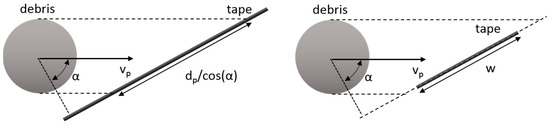 The aforementioned damage model was developed comparing the tape to a thin plate, a condition that can be considered satisfied for small debris (Figure 7, left); however, there are configurations in which such a hypothesis cannot be confirmed, i.e., when the debris diameter projection on the tape is larger than the tether width (Figure 7, right). Therefore, the model needs to be adapted to this new configuration; a proposed solution is reported in Equation (10), substituting the debris projection dp/cos(α) with the tether width.