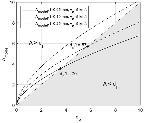 Despite the good results from the AHM, some issues were highlighted on its range of applicability. The model is based on experimental and simulation data with a ratio dp/t in the range 10–46 and it is improved with available literature data from thin plates (dp/t in the range 5–35). For this reason, it is expected that for higher dp/t ratios (dp/t > 50), the model could have lower precision. In particular, Figure 8 shows that for larger debris sizes, the AHM tends to underestimate the damage when it becomes smaller than the debris diameter. For this reason, this model is suggested only for tapes with a small w/t ratio (i.e., w/t < 100), for which large values of dp/t could be reached only for debris with a diameter comparable to the tape, that would already cause damage wide enough to sever it.