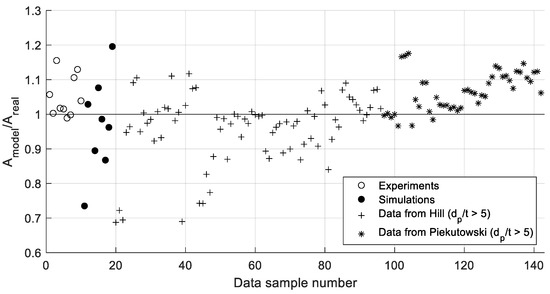 Comparison between AHM model and results available from tape experiments and simulations (circular marks) and from thin plate historical data (data from Hill [31], Piekutowski [39]).