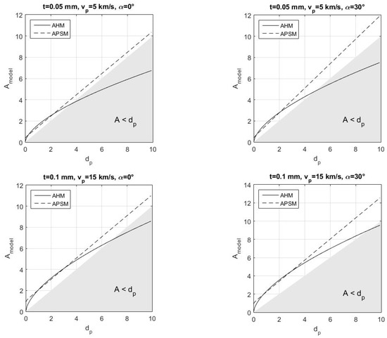 A brief comparison between the two elaborated models is reported here. Figure 10 shows that both the AHM and the APSM present similar behavior for small size debris at different thicknesses and velocities; it is determined that for values of dp/t in the range from 5 to 35, the difference is less than 15% for thicknesses up to 0.5 mm. For larger particles, the two model predictions diverge: the APSM shows a linear trend and predicts a damage larger than the debris diameter, while the AHM damage prediction decreases below the particle size for large debris.