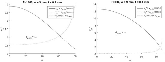 Again, it must be underlined that this generalization is valid for the Al-1100 model. The PEEK parameters were derived using the same literature dataset, and the obtained model, still valid for tether data, would require further investigation to evaluate the influence of the tape thickness. In all the aforementioned cases, it must be remembered that for low normal velocities, the damage size needs to be calculated using the correction parameter σ.