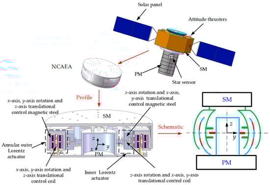 With the advancement of space technology, the next generation of space telescopes, high-resolution agile remote sensing, and gravitational wave detection missions impose higher demands on the attitude control performance of spacecraft [,,]. In order to further improve the attitude control performance of spacecraft, based on the design concept of dynamic and static isolation, our research team has proposed the new concept of non-contact annular electromagnetic stabilized spacecraft (NCAESS), which effectively mitigates the problems of dynamic coupling and nonlinear effects that occur in traditional designs of non-contact spacecraft []. In previous studies, we have mainly focused on the influence of the control torque on the attitude of NCAESS. The precision of the torque is linearly related to the driving current of the non-contact annular electromagnetic actuator (NCAEA), the main actuator in NCAESS. In order to ensure the precision of the control torque and improve the control performance of NCAESS, the driving current control of NCAESS is investigated in this paper.