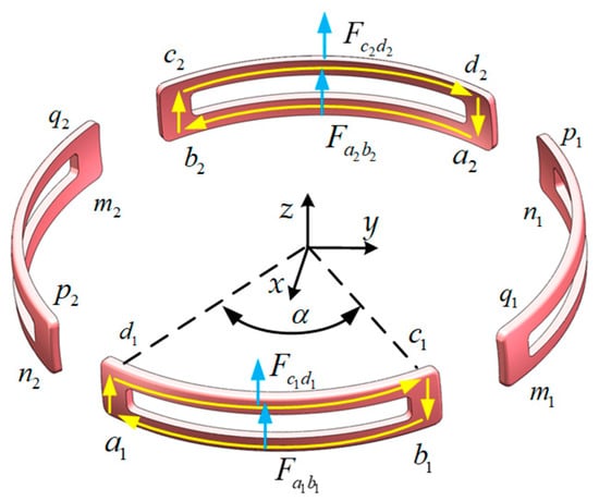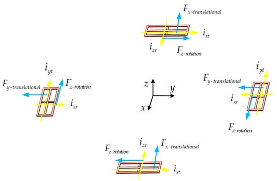 where rh is the annular radius of the outer coil; Tx and Ty are the attitude control torque of the PM, deflecting around the x- and y-axes, respectively; and Fx+, Fx−, Fy+, Fy− represent the Lorentz force generated by a1b1c1d1, a2b2c2d2, m1n1p1q1, and m2n2p2q2, respectively, as shown in Equation (2):