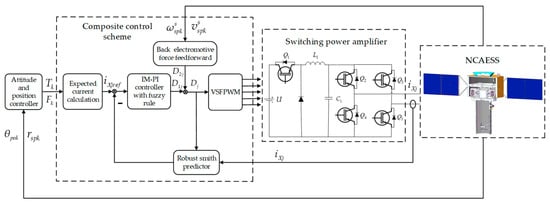 Based on the power amplifier model described above, in order to achieve a precise driving current performance, this paper adopts a composite control scheme to design the NCAESS control system, as shown in Figure 7. The entire control system is divided into four parts: the expected current solution of the outer and inner coils, the composite control algorithm, the switching power amplifier, and the NCAESS. The control system first uses the current calculation module to calculate the expected current of each coil based on the position control torque and translation control force calculated by the PM attitude controller and the relative position controller. Second, the switching power amplifier is controlled by a composite control scheme consisting of variable-switching-frequency pulse-width modulation (VSFPWM), feedforward compensation, robust Smith prediction (RSP), and an internal model proportional–integral (PI) controller with fuzzy rule to achieve high-precision driving current control. Finally, the Lorentz force generated by the driving current and the magnetic field controls the movement of the NCAESS, and the PM attitude pok(k = x,y,z) and the relative position rspk act as feedback to the PM attitude controller and the relative position controller.