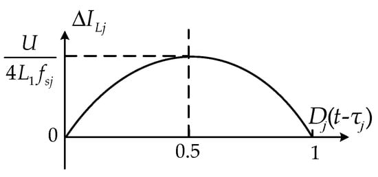 According to Equation (14), it can be seen that the amount of current ripple on the filter inductor is related to the modulation wave amplitude (i.e., the duty cycle), the triangular carrier frequency, and the filter inductor value. The current ripple decreases as the triangular carrier frequency and inductance value increase, while the current ripple and modulation wave amplitude have a nonlinear relationship, as shown in Figure 8. When the modulation wave amplitude is 0.5, that is, when the duty cycle is 50%, the ripple is the largest. When the modulation wave amplitude is larger or smaller than 0.5, the ripple also decreases.