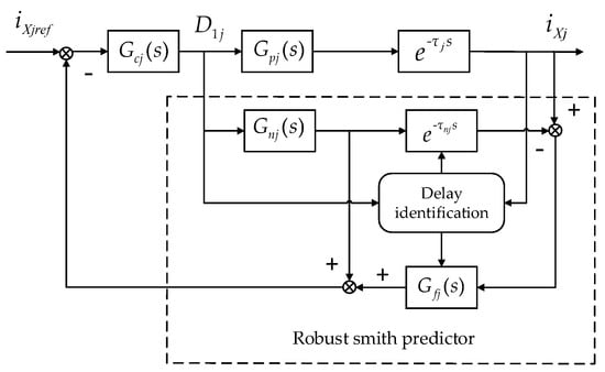 To solve the problem of time delay caused by digital control, compensators are commonly constructed to reduce the effect of the delay. Delay-compensating technology can be classified into model-based technology, such as the robust Smith predictor; model predictive controllers; model-free technology; and so on []. J. Liu proposes an improved capacitor circuit by using multi-loop feedback current to mitigate the impact of delay on the network []. However, this multi-loop method requires the measurement of multiple state variables, which increases the complexity of the controller and reduces the reliability. Ref. [] introduces a delay compensation method based on second-order generalized integrators to extend the stable region of a two-loop grid-current feedback control system. A. Katkout used a long-term prediction method to compensate the computational delays in multilevel inverter control loops []. S. Karan used a robust Smith predictor to eliminate the delay terms in the unstable control systems []. Through an analysis of the above literature, it is found that although model-free technology does not depend on the accuracy of the model, it struggles to fully compensate for the effects of time delays. Model-based technology is sensitive to the accuracy of system modeling. To better compensate for the effects of delay, the robust Smith predictor can be adopted to provide more advantages.