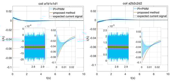 As shown in Figure 13, Figure 14 and Figure 15, it can be seen that compared with the combination method of PWM and PI, which is commonly used in driving control, the composite control scheme improves the driving current in the outer-coil a1b1c1d1, a2b2c2d2, m1n1p1q1, and m2n2p2q2 up to approximately 10 times under the multiple disturbances. Similarly, the driving current in the inner coil responsible for z-axis rotation control is enhanced up to approximately 10 times, too. Furthermore, both types of coils exhibit better dynamic responses with the composite control scheme, alleviating output current fluctuations. The response speed of the driving current for the outer coil is increased to approximately 1.5 ms, while for the inner coil, it is improved to approximately 2 ms. Obviously, the composite control scheme proposed in this paper demonstrates stronger robustness and a better response speed compared to the traditional method, which better meets the precise driving requirements of NCAESS.
