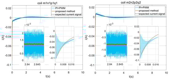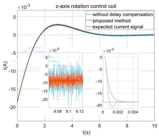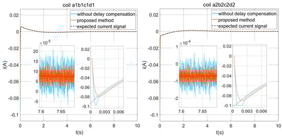 The robust Smith predictor is used to compensate the time delay in the proposed composite control algorithm in this paper. To verify the effectiveness of the robust Smith predictor, this paper conducts a comparative simulation analysis between using the robust Smith predictor for time delay compensation and not considering such time delay compensation. Figure 20 and Figure 21 show the simulated comparison of the driving current of the outer coil and the inner coil, respectively. Figure 20 and Figure 21 indicate that the composite control algorithm using the robust Smith predictor approximately doubles the current accuracy compared to the scenario without time delay compensation. It solves the stability problem caused by the time delay and reduces the overshooting, enhancing the dynamic response of the driving current control system. Therefore, employing the composite control scheme with RSP can compensate for the time delay, enhancing the stability and dynamic response of the driving current control system.