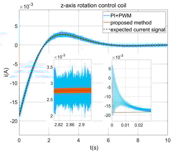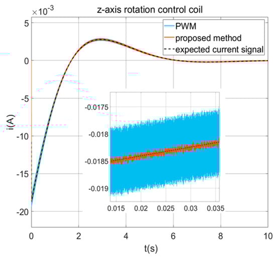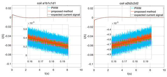 In response to the problem of current ripple during the modulation of the switching power amplifiers, the composite control scheme designed in this paper includes a VSFPWM based on current ripple prediction. Considering the similar driving current waveforms in the annular outer-coil a1b1c1d1, a2b2c2d2 and the annular outer-coil m1n1p1q1, m2n2p2q2, this paper performs a simulation analysis of the driving currents for the annular outer-coil a1b1c1d1, a2b2c2d2 and, subsequently, the z-axis rotation control coil. The comparative simulations using the traditional PWM and the VSFPWM are shown in Figure 16 and Figure 17. It can be seen that compared with the traditional PWM, the composite control algorithm using VSFPWM can maintain the current ripple within the range of 100 μA in the outer coil and inner coil by adjusting the switching frequency adaptively. However, the current ripple size in traditional PWM varies with the modulation wave amplitude, and its peak value exceeds the range of 100 μA. Therefore, the composite control scheme, by using VSFPWM, can suppress the switching current ripple effectively.
