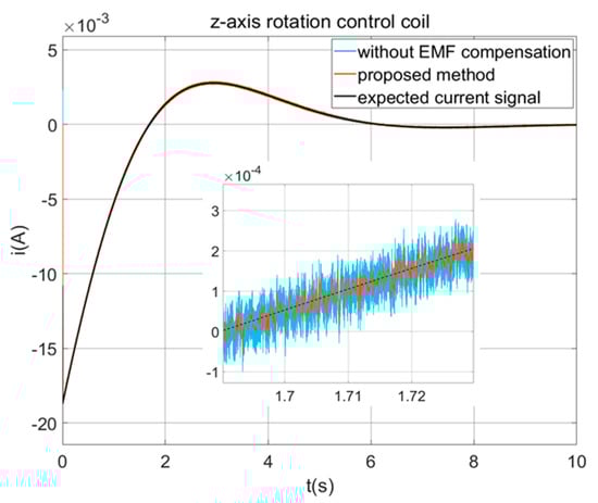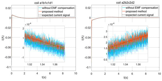 As shown in Figure 18 and Figure 19, it is clearly evident that the composite control scheme with back electromotive force feedforward compensation can improve the precision of the driving current in both the outer and inner coils by about one time when outputting low-amplitude current, and reduce the steady-state error by about 30 μA. Therefore, the composite control algorithm using back electromotive force feedforward compensation can suppress the back electromotive force disturbances and improve the precision of the driving current effectively when the two modules move relative to each other.