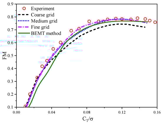 To verify the accuracy of the BEMT and CFD method, the XV-15 tiltrotor in hovering flight is chosen to calculate its aerodynamic performance. For the CFD method, three sets of embedded grids are generated, 245 × 50 × 66 (chordwise, normal, and spanwise directions) (coarse grid), 305 × 60 × 106 (medium grid), and 405 × 80 × 126 (fine grid) for blade and 91 × 110 × 95 (coarse grid), 91 × 110 × 95 (medium grid) and 121 × 140 × 120 (fine grid) for background. In addition, the grid height of the first layer on the blade surface is set to 1.0 × 10−6, ensuring y+ less than 1.0. Figure 1 shows the calculated figure of merit (FM) of the XV-15 tiltrotor by BEMT and CFD methods compared with experimental data at a tip Mach number of 0.69 standard blade tip speed, and the calculated values of FM agree well with the experimental data [23]. As can be seen, the medium and fine grids for CFD method can simulate the aerodynamic performance of tiltrotor in good agreement with the test, and the BEMT solver matches well with the CFD method and test. For the rest of the paper, a medium grid is used for aerodynamic characteristics of the tiltrotor.