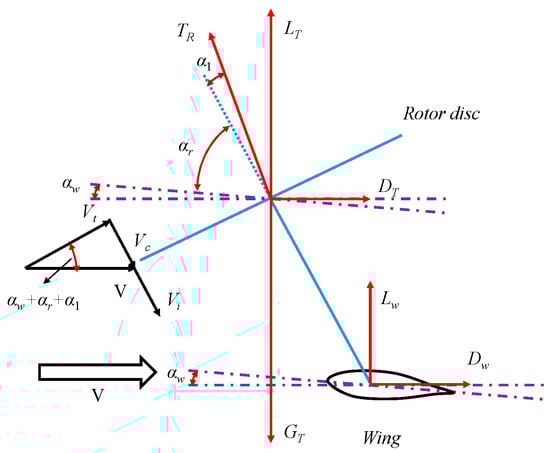The objective of this paper is to analyze the trimming characteristics of the tiltrotor and wing during a stable conversion state. Therefore, only the longitudinal trim characteristics of the tiltrotor aircraft are considered. Figure 2 depicts the aerodynamic environment and forces experienced by the tiltrotor and wing during the conversion procedure. In the figure, Vc represents the flow velocity perpendicular to the rotor disc, while Vt is the flow velocity parallel to the rotor disc.