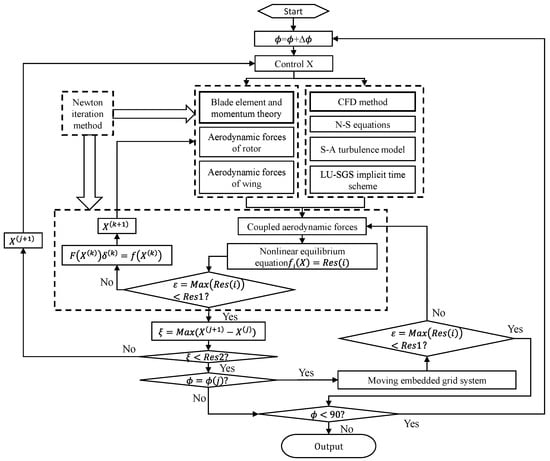 where superscript i represents the number of iterative steps of the CFD method when the step of tilting angle for the tiltrotor is j, k the number of iterative steps of the BEMT model, and superscript d the target aerodynamic performance parameters. Figure 3 shows the procedure of the hybrid trimming method.