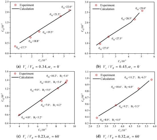 To assess the efficacy of the hybrid trimming method, calculations of the aerodynamic performances of the XV-15 tiltrotor in various flight modes are conducted. Figure 4 presents a comparison between the trimming results and experimental data [26] regarding the aerodynamic characteristics of the tiltrotor. Specifically, subfigures a and b correspond to the cruise state, while subfigures c and d represent the conversion procedure. It is evident that the calculated results for rotor torque and thrust coefficient align well with the experimental values, thereby demonstrating that the established hybrid trimming method meets the requirements for aerodynamic modeling of tiltrotors.