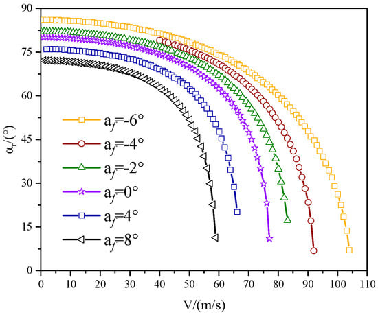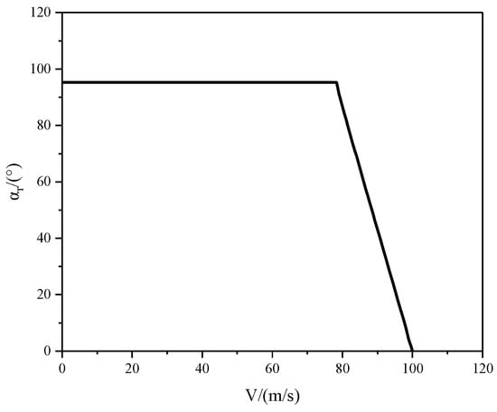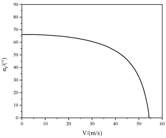 By solving the equilibrium equations and the geometric relationship between the AoAs of the wing and fuselage, the tilt-angle–speed envelope on low-speed boundary is obtained, as shown in Figure 6.