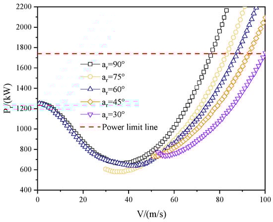 In forward flight, the calculation of the rotor required power for the XV-15 aircraft is conducted at specific engine nacelle tilt angles. The variations of the required power with different tilt angles and flight speeds are depicted in Figure 7. By considering the available power of the engine, the tilt-angle–velocity envelope on the high-speed boundary is ultimately determined, as presented in Figure 8.