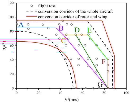 Figure 10 also illustrates the relationships between three specific conversion paths within the conversion corridor. All three paths initiate from a hover state with an engine nacelle tilt angle of 85°(point A in the figure). When the flight speed of the aircraft or rotor/wing reaches 36 m/s (point B in the figure), the engine nacelle begins to tilt at the same angular velocities towards point C (αr = 75°, V = 42.7 m/s) in the figure. Subsequently, various combinations of angular velocities and flight speeds are employed.