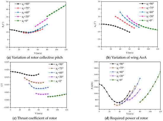 The rotor in the conversion corridor undergoes a transition at an angular velocity of 1.5°/s along different paths. Figure 16 illustrates the results of the trimming and the aerodynamic characteristics of the rotor on path I. As shown in Figure 16a, the collective pitch of the tiltrotor initially decreases slightly and then rapidly increases with increment of flight speed, resembling the behavior of a helicopter in forward flight. However, the thrust coefficient of the tiltrotor decreases slightly at low speeds and then decreases rapidly at high speeds. Furthermore, the required power does not exceed the rated power of the engine, as shown in Table 2, and the highest power is required in hovering and cruising flight conditions. Due to the coupling of tilting angle, forward flight speed, horizontal acceleration, decreasing rotor thrust, and the aerodynamic interaction between the rotor and wing, a complex variation in the AoA of the wing occurs, as depicted in Figure 16b. During the initial process of the rotor transition from hovering to forward flight, the tiltrotor aircraft experiences nose-down pitches as it accelerates. However, when the nose-down pitch reaches a critical value, the tiltrotor is unable to provide sufficient vertical lift and horizontal thrust. Consequently, the negative lift and drag of the wing must be reduced by pitching upward. The rotor begins to tilt when the flight speed reaches 36 m/s, causing a loss of rotor lift. As the tilt angle of the rotor increases, the wing needs to contribute more lift, resulting in a continuous increase in the AoA of the wing. As the aircraft accelerates, although the lift of the wing still increases, the required lift coefficient and AoA gradually decrease due to the inverse relationship between lift coefficient and dynamic pressure (including the velocity squared term). This trend persists until the aircraft completely transitions to the fixed-wing flight mode.
