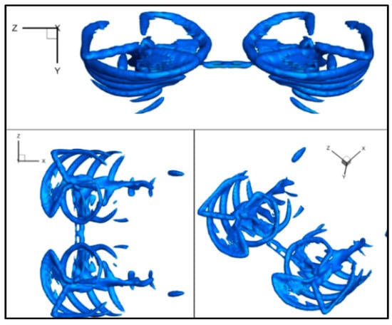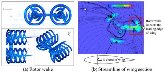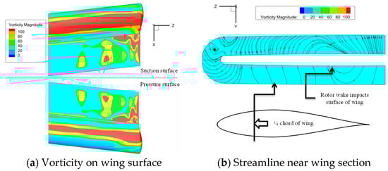 Figure 14 shows the distribution of the rotor wake, and Figure 7 gives the vorticity and streamline of the flowfield between the rotor and wing. It is clear to see the distribution characteristics of the tip vortex and root vortex, as well as the changes after collision interference with the wing.