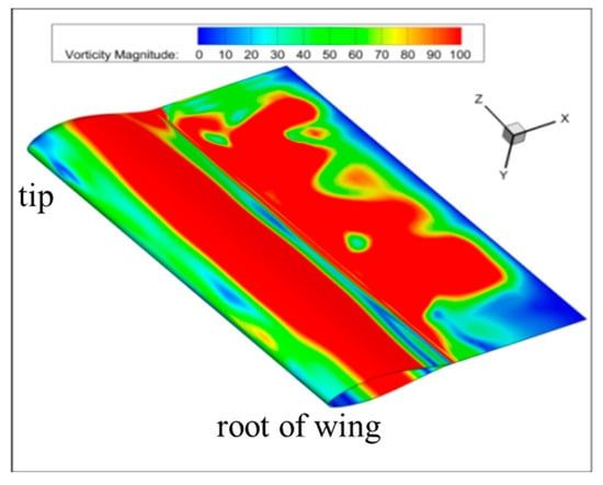 Figure 13 shows the distribution of vorticity on the wing suction surface. It can be seen that the impact of the blade tip vortex causes a significant increase in vorticity on the wing surface. This is due to the large total pitch of the tiltrotor in this state, and the detached wake vortex in the middle section of the blade collides with the wing surface.