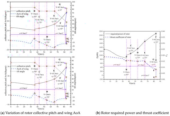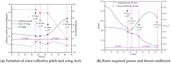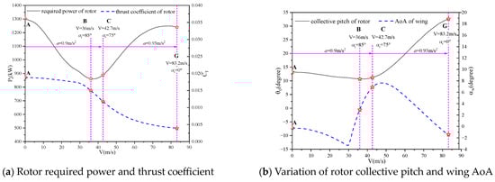 Figure 17 presents the results of trimming and the aerodynamic characteristics of the tiltrotor on path II. In comparison to path I, the trend in the variation of the rotor collective pitch remains almost the same. However, the AoA of the wing undergoes significant changes due to the reduced acceleration of the aircraft between points B and G. The varying tilting strategies also result in a decrease in both the thrust and the required power generated by the rotor, as depicted in Figure 17b. Therefore, a slight acceleration would be beneficial for improving the aerodynamic efficiency of the rotor, although it would increase the complexity of the fuselage attitude.