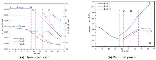 Conversion Path III (A-B-C-D-E-FG): Differing from Path II, the aircraft directly accelerates to 65.5 m/s (point E in Figure 9) from point C without tilting the engine nacelle. Subsequently, the engine nacelle tilts to 42° (point F in Figure 9, V = 83.2 m/s) at a constant speed. Finally, the engine nacelle continuously tilts until reaching fixed-wing aircraft mode with a constant flight speed. Notably, the forward flight speed remains consistently at 83.2 m/s for all three paths during the transition to fixed-wing aircraft mode.