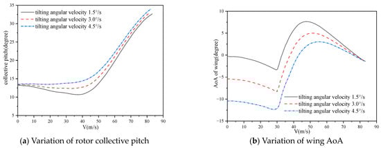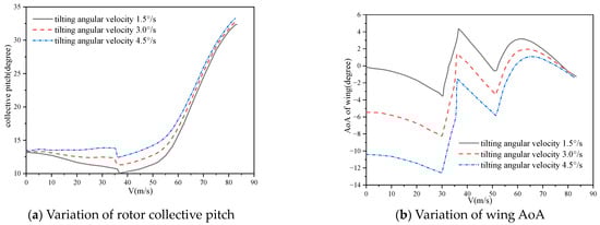 Based on the investigations of the conversion corridor above, the corresponding manipulations of the tiltrotor and wing are obtained through the solution of equilibrium equations. By adopting the conversion paths shown in Figure 9 and specifying three tilt angular velocities (1.5°/s, 3.0°/s, 4.5°/s) of the tiltrotor, the tilting characteristics and aerodynamic characteristics of the rotor/wing are investigated.