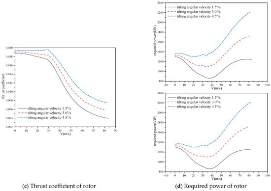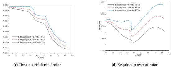 Figure 20 displays the variations of rotor manipulation and aerodynamic characteristics for path I, as illustrated in Figure 9, with different tilting angular velocities. As evident from the figure, the trend of lift changing with flight speed remains consistent across various tilting angular velocities. Specifically, Figure 20a,b demonstrate that the collective pitch of the rotor increases with the increment of tilting angular velocity, whereas the angle of attack (AoA) exhibits an overall decreasing trend. Consequently, the thrust coefficient and required power of the rotor also increase, as depicted in Figure 20c,d, respectively. However, it is worth noting that at high flight speeds, the required power may approach, or even exceed, the rated power of the engine due to the large tilting angular velocity. Hence, it is more suitable to employ a moderate tilting angular velocity for the conversion process of a tiltrotor.