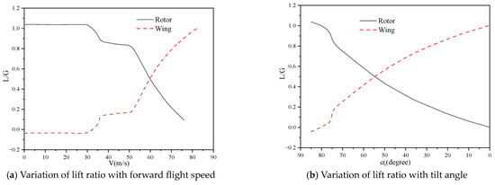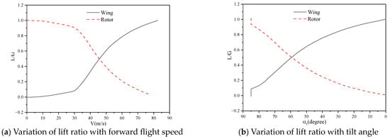Based on the various tilt-angle–speed paths explored above, it becomes evident that path I, characterized by a low tilting angular velocity and small acceleration, is more reasonable. Figure 22 and Figure 23 present the matching features of the lift generated by the rotor and wing under two different tilt-angle–speed strategies, respectively. In the first strategy depicted in Figure 22, when the rotor shaft tilt angle is 59° and the forward flight speed is 45 m/s, the lift produced by the rotor and wing is equal, indicating that the wing begins to bear most of the gravity burden for the entire aircraft. In the second strategy illustrated in Figure 23, the intersection points of the wing and rotor lift curves occur at a rotor shaft angle of 55° and a forward flight speed of 59 m/s. Thus, a low tilting angular velocity and small acceleration facilitate the transition from rotor-lift dominance to wing-lift dominance at higher tilt angles and lower flight speeds.