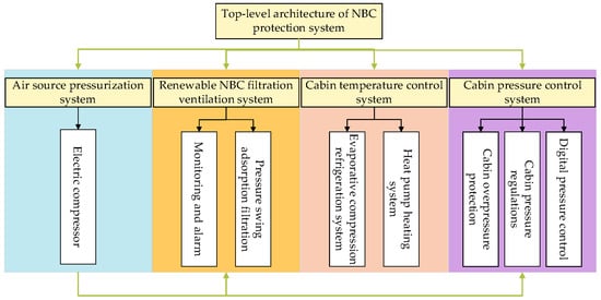 Currently, there is no established NBC protection system for helicopters, and the CPS used in ships cannot be effectively applied to helicopters. Consequently, NBC protection for helicopters primarily relies on individual protective measures. To address this gap in helicopter NBC protection, this paper proposes a top-level architecture-based system integration approach to design a comprehensive helicopter NBC protection system. The functional modules of the system are shown in Figure 1. The system comprises four subsystems: an air source pressurization system, a renewable NBC filtration ventilation system, a cabin temperature control system, and a cabin pressure control system. Although each subsystem adopts a modular design, they are not completely independent of one another. Through systematic integration, function matching and working mode switching can be achieved.