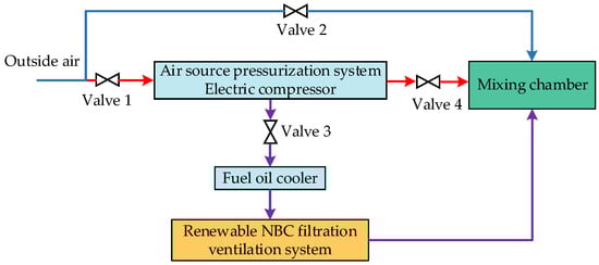 In the renewable NBC filtration ventilation mode, the system workflow is shown by the purple line in Figure 3. Valves 1 and 3 are open, while valves 2 and 4 are closed. The outside NBC air undergoes pressurization by the electric compressor before entering the fuel cooler, where its temperature is lowered to meet the filtration requirements. Subsequently, it flows into the renewable NBC filtration ventilation system.