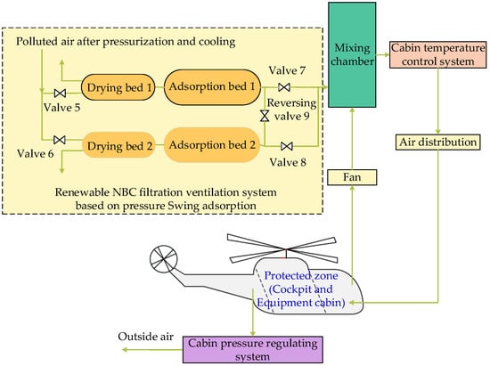 Traditional CPS commonly utilizes activated carbon for the adsorption of radioactive dust, biochemical aerosols, or toxic vapors. However, these systems have a limited operational lifespan and necessitate frequent filter replacement. Hence, this paper proposes a renewable NBC filtration ventilation system based on PSA that enables helicopters to undertake prolonged missions in contaminated areas. The system configuration is shown in Figure 4.
