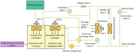 The cabin temperature control system is utilized to regulate the temperature of both the cockpit and equipment cabin, ensuring optimal operational conditions for the helicopter’s aircrew and equipment in various atmospheric environments. In this paper, a cabin temperature control system that utilizes a heat pump evaporative refrigeration cycle, waste heat recovery from lube oil, and comprehensive temperature control technology for two cabins is proposed. The system configuration is shown in Figure 5.