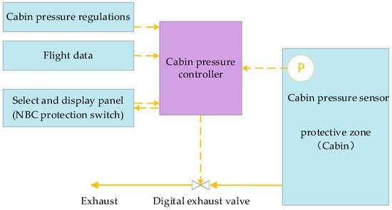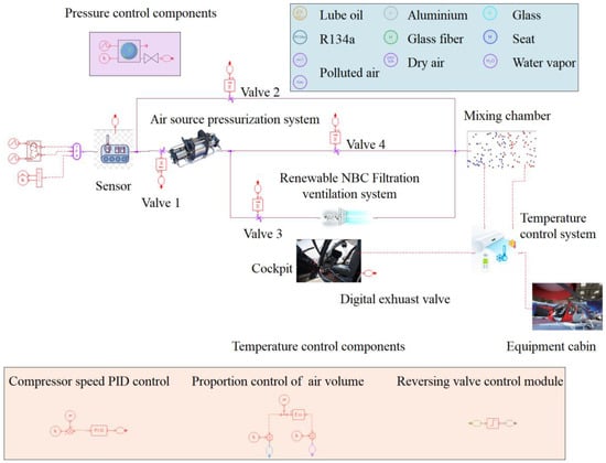 The overall architectural design and operational process of the system are shown in Figure 2. By manipulating the opening and closing of valves 1 and 2, switching between the air source pressurization mode and free ventilation mode can be achieved. The utilization of the free ventilation mode is restricted to situations where there is no requirement to activate the NBC protection of the cabin. On the other hand, the air source pressurization mode not only facilitates cabin pressurization but also ensures overpressure safeguarding.
