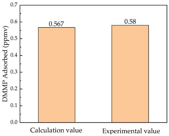 where θ is the actual adsorption amount of DMMP, ppmv; θmax is the theoretical maximum adsorption capacity of DMMP, ppmv; α is an empirical parameter, which represents the surface affinity of DMMP and is usually called the Langmuir constant, α = 1.7 [17]; and Cbulk is the volume concentration of DMMP, ppmv.