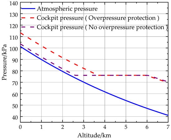 The regulation governing the variation in absolute pressure and residual pressure with altitude is referred to as cabin pressure regulation. In accordance with the anticipated design requirements, the curve representing the cabin pressure regulations is depicted in Figure 8, where the atmospheric pressure is based on the International Standard Atmosphere (ISA) 1976.