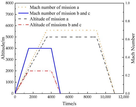 Due to the operational requirements of helicopters in various weather conditions, this article presents three types of flight missions: Flight mission A involves taking off under standard atmospheric conditions (15 °C), cruising at an altitude of 5 km, and continuing the mission for 11,000 s. Flight mission B is designed for extremely hot conditions during summer, with takeoff at a ground ambient temperature of 40 °C using ISA + 25 hot conditions. The helicopter will cruise at an altitude of 2 km and continue the mission for 5000 s. Lastly, flight mission C addresses extreme cold conditions during winter by utilizing ISA − 55 cold conditions. Takeoff occurs at a ground ambient temperature of −40 °C while cruising at an altitude of 2 km for a duration of 5000 s. The flight mission profiles are shown in Figure 10.