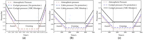 Changes in cockpit pressure. (a) Flight mission A; (b) Flight mission B; (c) Flight mission C.