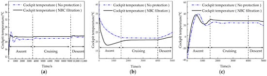 Changes in cockpit temperature. (a) Flight mission A; (b) Flight mission B; (c) Flight mission C.