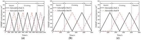 Changes in DMMP adsorption capacity. (a) Flight mission A; (b) Flight mission B; (c) Flight mission C.