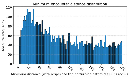 The absolute frequency distribution of the recorded CA distances, relative to , is shown in Figure 1. The graph represents only the encounters within a distance of 200 Hill’s radii. These are approximately 5500 out of the total events recorded. The plot shows that encounters take place at every distance, with most of them being within the range between 10 and 40 . The long distances observed from these data allow us to exclude the effect of the asphericity of the perturbing asteroid on the overall perturbation of the flyby. This effect diminishes as , with [31], and the distances we deal with in these cases are long enough to neglect this effect. Moreover, we are considering dimensions much greater than the radii of the asteroids, which is the typical distance at which asphericity becomes prominent over other major perturbations [32].