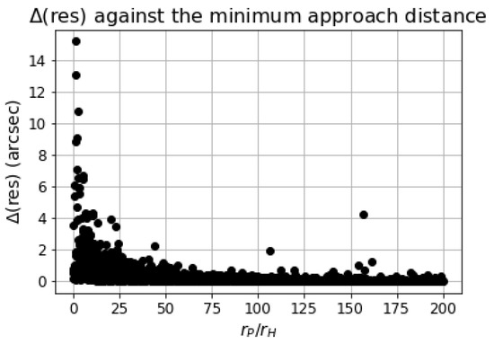 The plot in Figure 2 contemplates only single encounters, i.e., cases where an asteroid has one and only one close approach with one of the 300 perturbing asteroids in the model. Only 1700 resulted to be single encounters. In these cases, the effect of the flyby on the residuals is direct while, on the contrary, when multiple encounters occur, the impact of each flyby is challenging to disentangle.