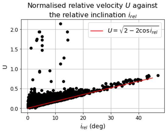 The region for high inclinations and low U is void, as per the natural domain of Equation (3). An example of limiting curve has been superimposed to the plot, representing the relationship for the encounter with a circular orbit with . Although this only represents a very particular case, the majority of the points are above the red line. For those below the line, the reason has to be found in values of eccentricities of both the perturbing and perturbed body different from zero.