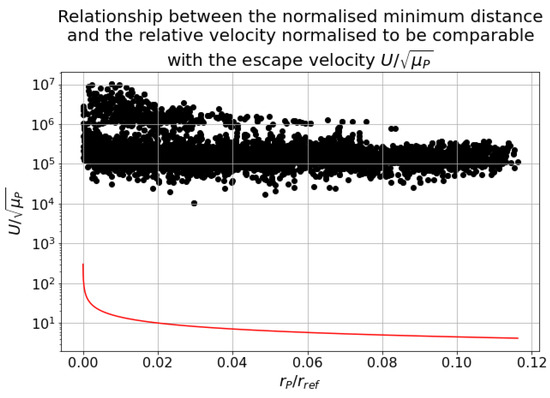 Considering the big encounter distances and the low masses involved in the cases of interest, Equation (4) will likely provide a very low threshold, easy to satisfy. This is shown in Figure 5, where the relative velocity and the approach distances are plotted compared to the curve of the escape velocity as a function of the distance. In order to represent in the same graph encounters with objects with different masses and semimajor axes, the quantities have been normalised accordingly, having on the x-axis and on the y-axis , with being the mass parameter of the perturbing body.