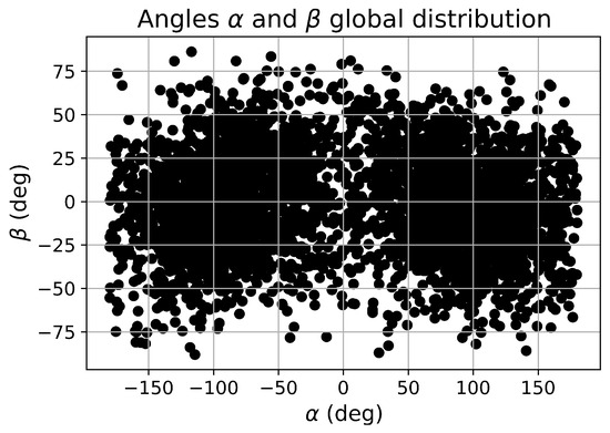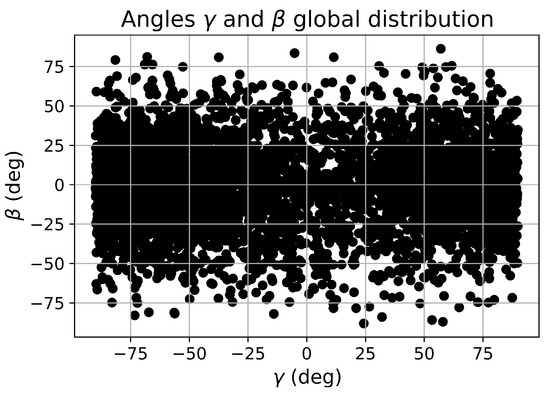 The angles used for representing , , , and , derived from the detected cases, and their relationships are illustrated in Figure 7 and Figure 8. Upon analysing the scatter plot in Figure 7, one can observe fewer occurrences where , indicating encounters happening directly above or below the perturbing body. Similarly, the same pattern is observed when or , signifying cases of encounters parallel to the perturbing body’s direction of motion.