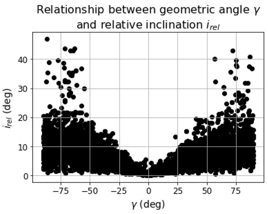 The angle is the parameter that defines how much the relative velocity is tilted with respect to the plane of the perturber. This links to the relative inclination. The latter is confirmed by Figure 9, where the values of are plotted against the respective values of angle. Their relationship is easily readable, with higher corresponding to higher values in . Hence, eventually in the context of simulations, relative inclinations and angles have to be tuned accordingly.