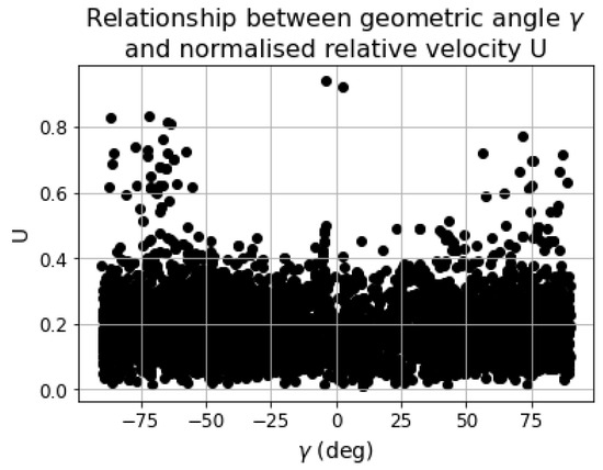 From this plot, one can say that higher values of U can take place only in the presence of high values of . The points are more uniformly distributed than in the previous plot, especially in the region around . Indeed, and U are not physically related, while the drivers for are both and U. For low values, no matter how much the velocity is, the relative inclination will always be low, while, on the contrary, it is possible to lower down U to get low for high s.